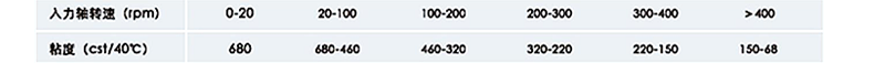 當(dāng)入力軸轉(zhuǎn)速之相應(yīng)粘度在兩種粘度范圍之間,請(qǐng)使用較高粘度的油品。